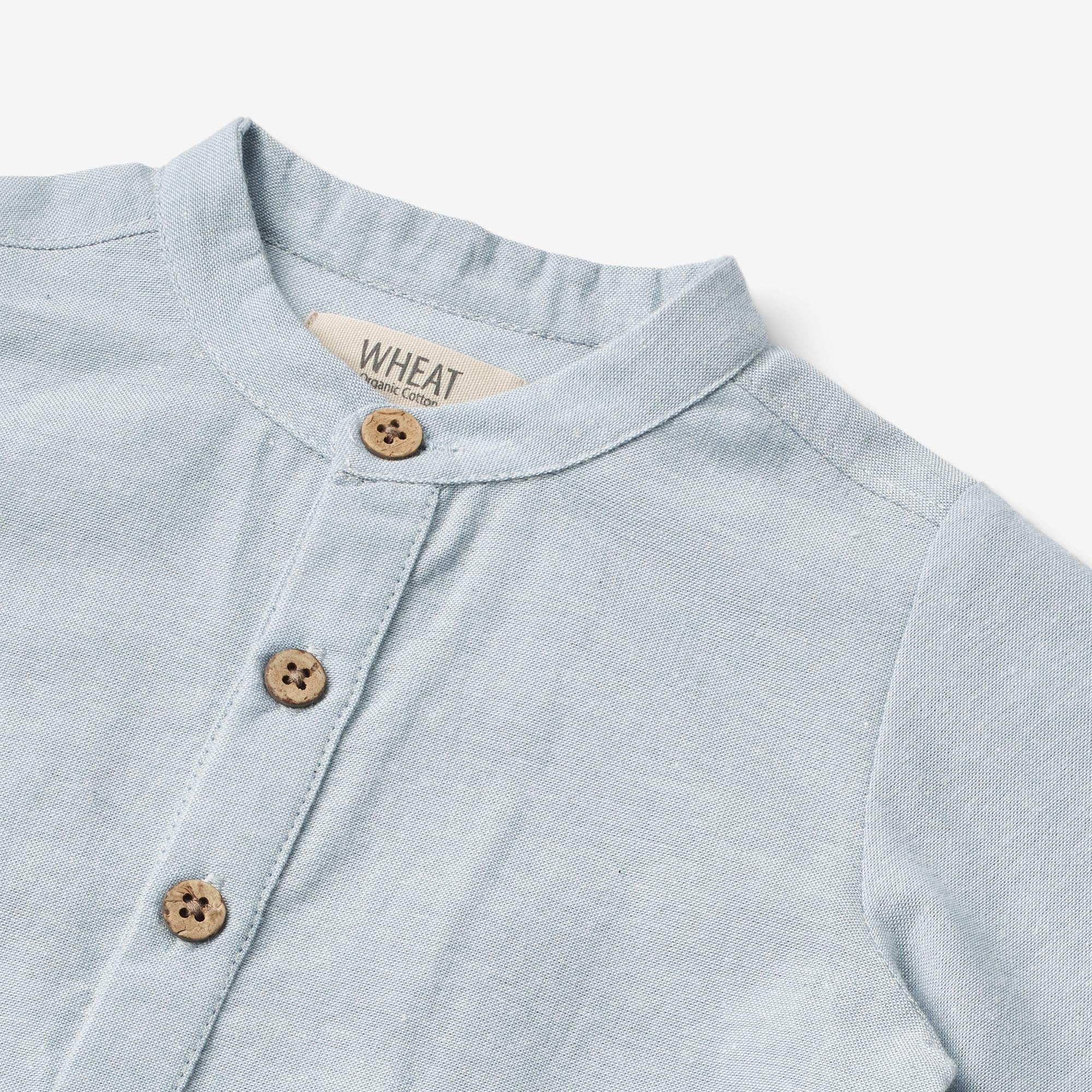 Wheatâs romper shirt is both cute and practical, as it is the perfect mix between a classic shirt and a romper, which ensures that the shirt stays put all day long. It is comfortable to wear with buttons halfway down the front as well as press button at the bottom to make it easier for you to dress your baby. It is perfect for special occasions and cozy days, where you can style it with a pair of shorts or trousers and a knit to complete the cute look.